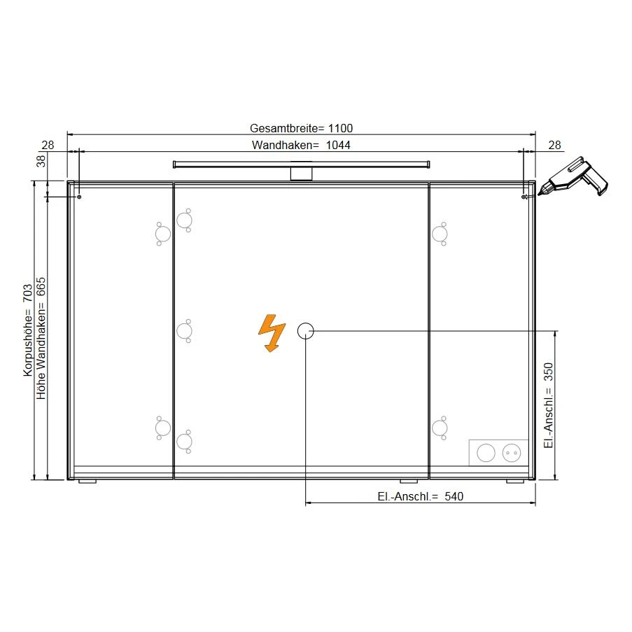 - Türaufteilung: links 25 cm, mittig 60 cm, rechts 25 cm
